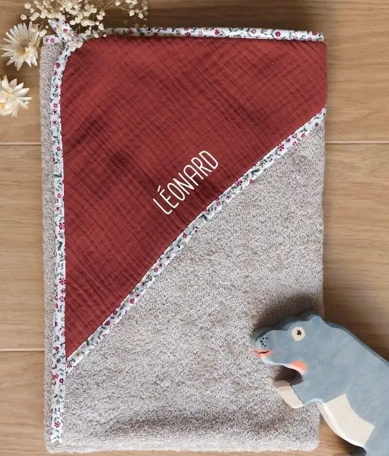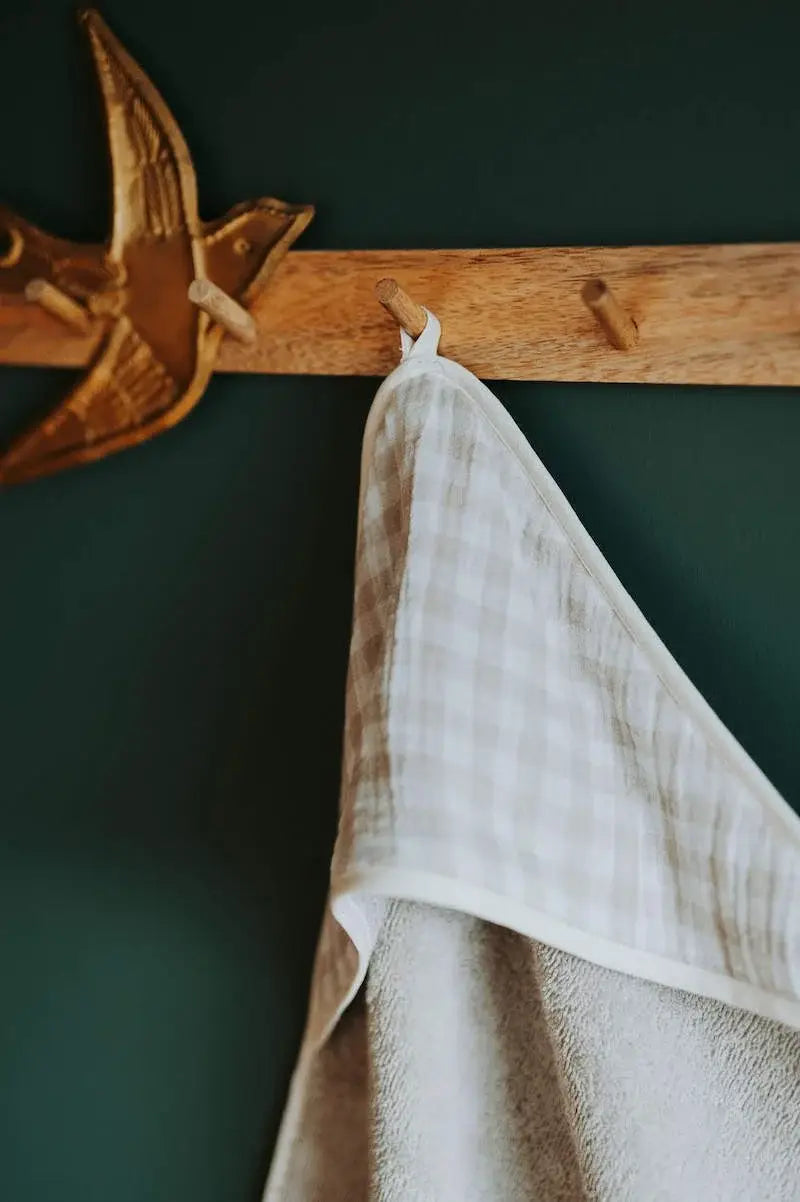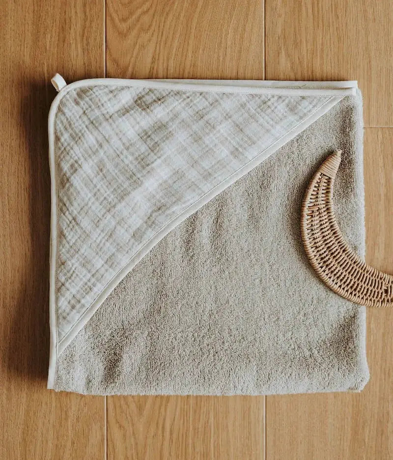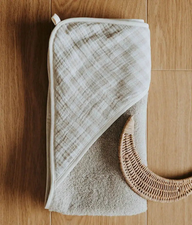 Pour envelopper bébé à la sortie du bain, offrez à bébé notre cape de bain super absorbante, toute douce et couvrante de la tête aux pieds dès la naissance grâce à sa capuche et sa taille adaptée. Double gaze vichy galet et éponge couleur galet certifiés sans substance nocive ou irritante.